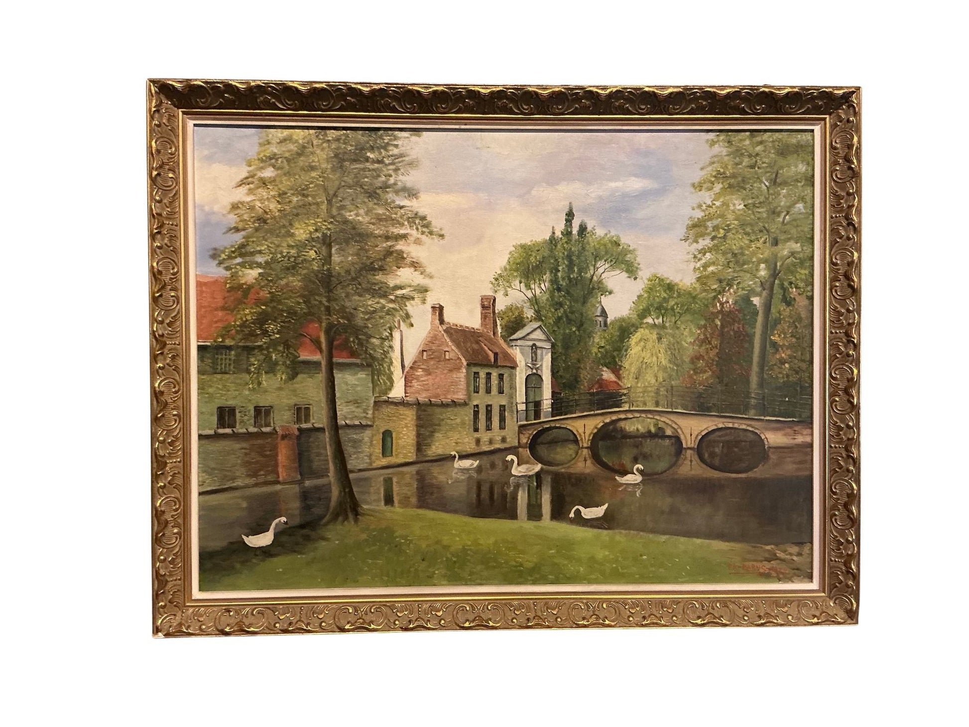 Beautiful oil painting in gold frame of the famous Bruges swan bridge.